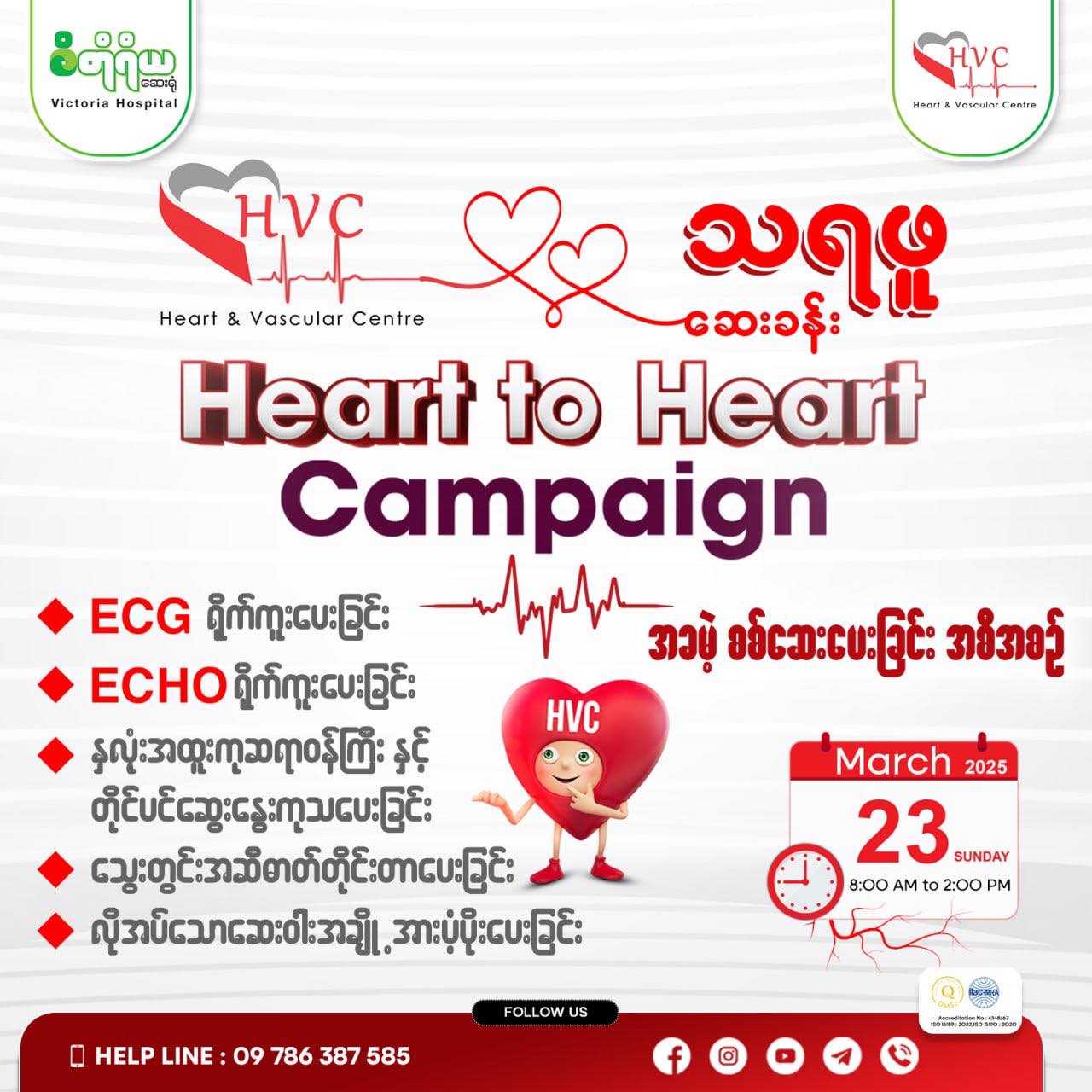 In collaboration with Victoria Hospital’s Heart & Vascular Center (HVC) and Tharaphu Clinic, a special “Heart to Heart Campaign” will be held at Tharaphu Clinic in Kawhmu Township, offering free heart health services for the community.
